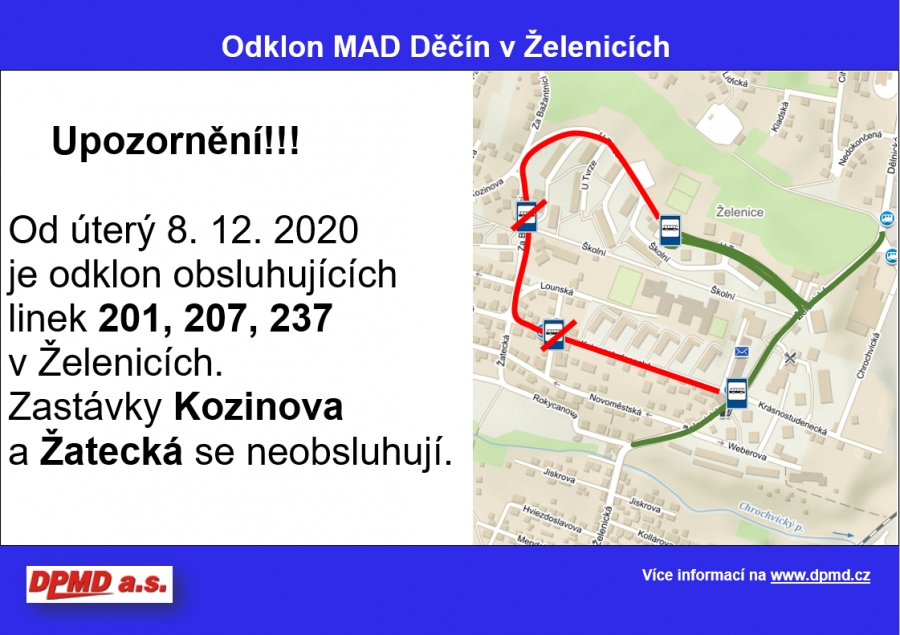 Od úterý 8. 12. 2020 od 8:00hod. dochází k dalšímu omezení pro obsluhující linky č. 201, 207, 237 v Želenicích.