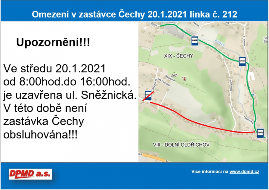 Ve středu 20. 1. 2021 od 8:00hod. do 16:00hod. je uzavřena ul. Sněžnická. Obsluhující linka č. 212 nebude v této době obsluhovat zastávku Čechy.